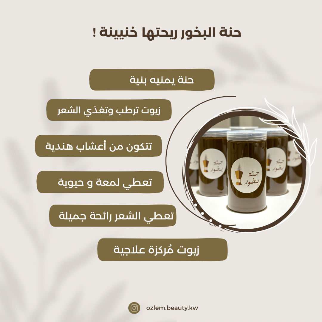 “دلّلي شعرك بشي مميز مع الحنّة والبخور! هالخلطة المثالية تجمع بين العناية المغذّية والريحة العربية الفخمة. مصنوعة من حنّة طبيعية وبخور مع بودرة نباتات هندية علاجية، هالماسك يقوي شعرك ويخليه ناعم ولامع. والريحة الجميلة تظل معاك طول اليوم. عطّي شعرك الحب اللي يستاهله بلمسة سحر وجمال تراثي!”