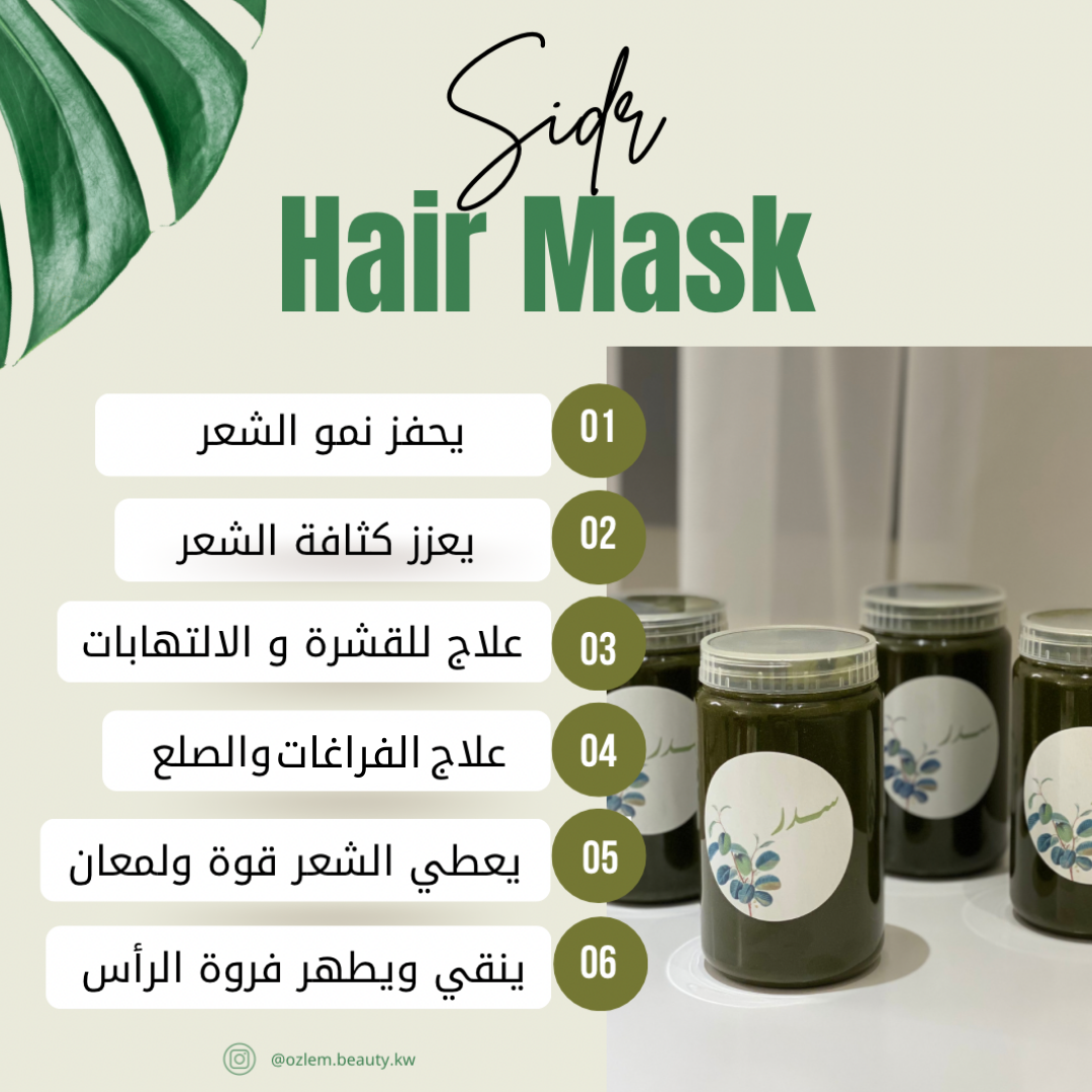 “خلطة السدر مصممة خصيصًا لتعزيز نمو الشعر وتغذية فروة الرأس، باستخدام قوة السدر الطبيعية ومزيج من الزيوت النقية. أوراق السدر معروفة من زمان بقدرتها على تنظيف وتعقيم فروة الرأس، وتخلي الشعر أنعم وتعطيه لمعة صحية وجميلة. الماسك يعالج فطريات الرأس، ويوفر حل طبيعي لفروة رأس نظيفة ومتوازنة. مثالي للي يبون يحسنون من ملمس الشعر، يقوون الخصلات، ويشجعون نمو الشعر الصحي. هذا الماسك هو خيارك المثالي لشعر لامع وحيوي.”